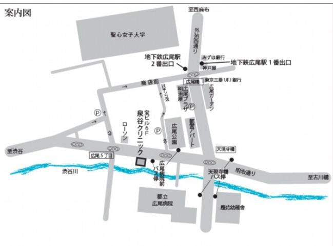 明治通り沿いにある「広尾病院前」バス停(渋谷行方向)の近くで、同じビルの2階には「たきもと歯科クリニック」が入っています。